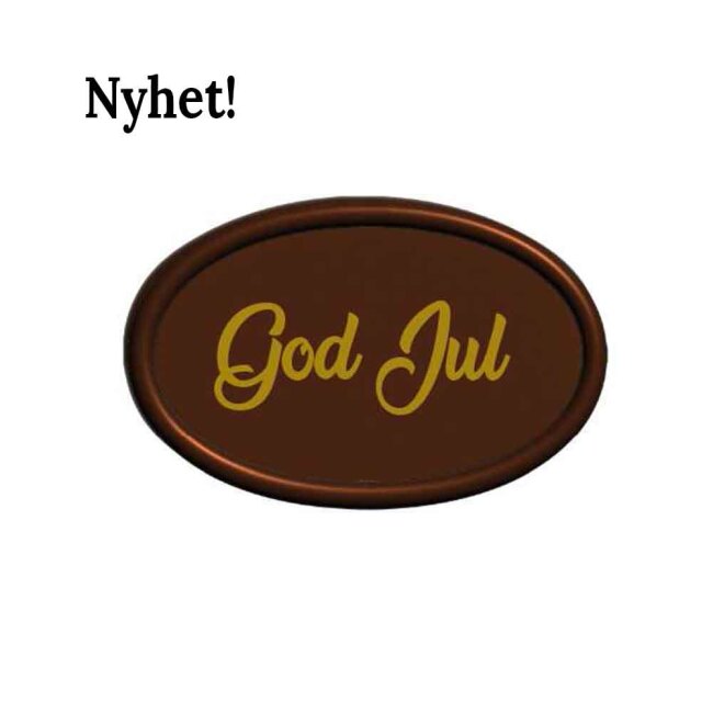 Dekoration i mörk choklad med guldtexten God Jul. För dekoration av desserter och tårtor. 55 x 35 mm. Vikt ca 4,2 g. Format F10.
