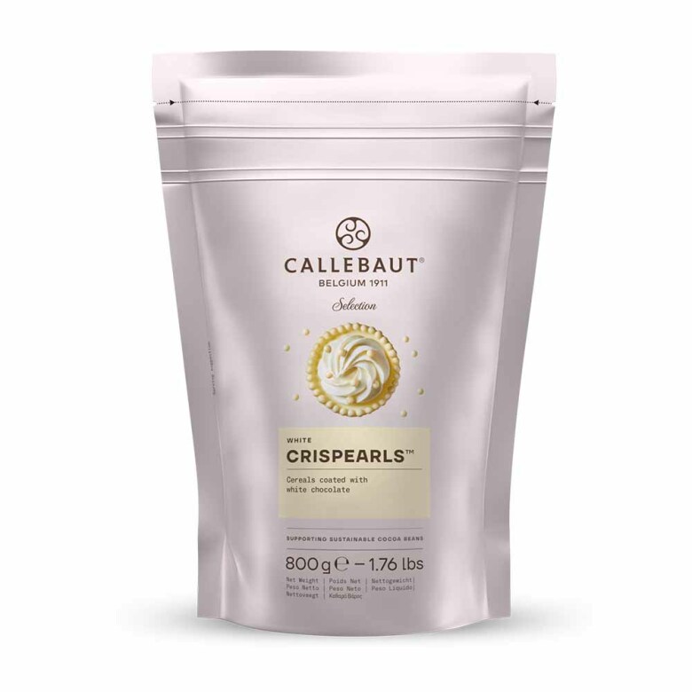 Crispearls är små krispiga vita pärlor av rostade kex täckta med Callebaut vit choklad från Belgien. Perfekt till glass, choklad, praliner, cupcakes, tårtor, desserter och bakverk. Tips: blanda ner i chokladmoussen eller glassen för en krispig struktur eller använd som strössel. 4 mm i Ø.