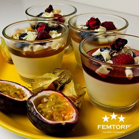 Pannacotta med vit choklad, färska bär & dekoration för säsong