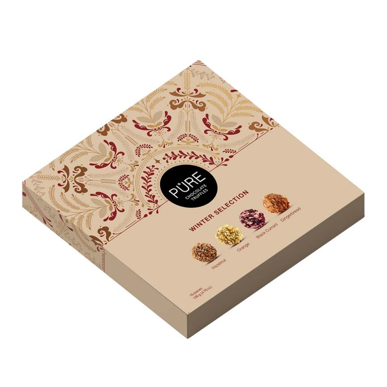 Njut av fyra utsökta tryfflar där mjölkchoklad möter krämiga och fruktiga fyllningar, och mörk choklad med en frisk citrusaccent. Perfekta att bjuda på, ge som present eller unna sig själv när man vill ha något extra.