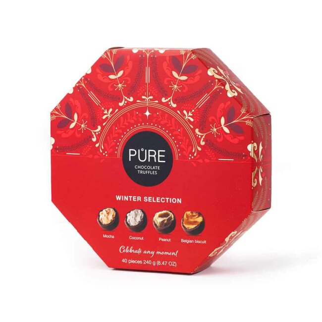 En läcker blandning av mjölk- och mörk chokladtryfflar med fyllningar som bjuder på både nötigt, krämigt och kaffeinspirerat. Varje tryffel är inslagen styckevis – enkelt att bjuda på eller ta fram till vardagslyxen.